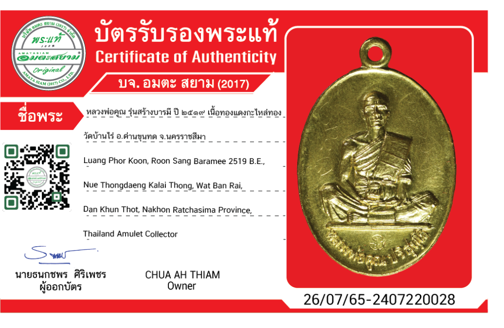 Luang Phor Koon, Roon Sang Baramee 2519 B.E., Nue Thongdaeng Kalai Thong, Wat Ban Rai, Dan Khun Thot, Nakhon Ratchasima Province, Thailand Amulet Collector