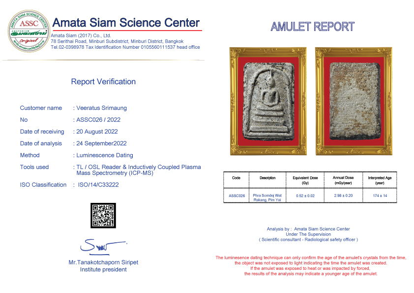 การคำนวณอายุพระเครื่อง (พระเครื่องจัดเป็นโบราณวัตถุ) จำเป็นต้องทราบปริมาณรังสีในตัวพระเครื่องและปริมาณรังสีของสิ่งแวดล้อม โดยทั่วไปวัสดุธรรมชาติที่ให้สารรังสีออกมาจากธาตุยูเรเนียม ทอเรียม และโพแทสเชียมเป็นหลัก อมตะสยามจึงได้นำเครื่องมือ ICP-MS (Inductively coupled plasma mass spectrometry)