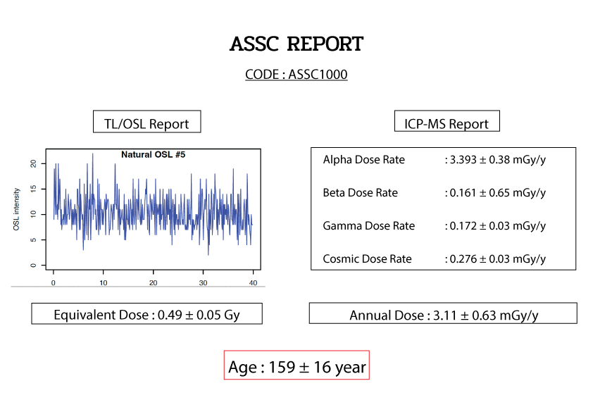 For dating, the amount of absorbed energy per mass of mineral due to natural radiation exposure since zeroing is known as the Equivalent dose which is measured by TL/OSL reader Lexsyg Research by using a light to stimulate directly to the sample then measuring it emit due to time. And the Annual dose is the amount of radiation that a sample is exposed to per annum during its burial period measure by ICP-MS (Inductively Coupled Plasma Mass Spectrometry) by using an energy from laser to sublimate the sample and ionized then measure the ion current which is precisely proportion of isotopes radiation which are Uranium, Thorium and Potassium then we bring both value for the further calculation.