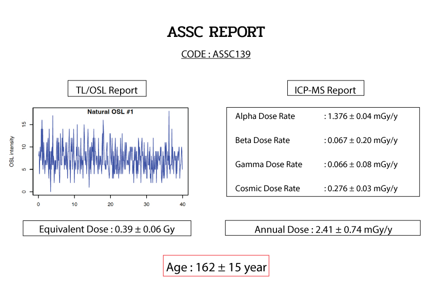 For dating, the amount of absorbed energy per mass of mineral due to natural radiation exposure since zeroing is known as the Equivalent dose which is measured by TL/OSL reader Lexsyg Research by using a light to stimulate directly to the sample then measuring it emit due to time. And the Annual dose is the amount of radiation that a sample is exposed to per annum during its burial period measure by ICP-MS (Inductively Coupled Plasma Mass Spectrometry) by using an energy from laser to sublimate the sample and ionized then measure the ion current which is precisely proportion of isotopes radiation which are Uranium, Thorium and Potassium then we bring both value for the further calculation.
