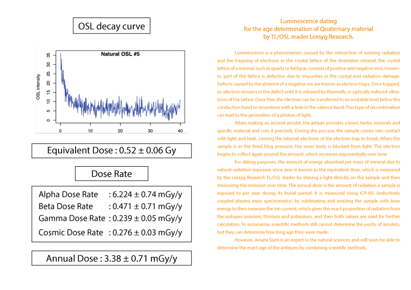 护身符年龄的计算被列为古董之一需要知道护身符从过去到现在累计接受的辐射量 (等效剂量)(Equivalent dose)。这可以由 TL/OSL 读取器 Lexsyg Research 通过对样本应用光来确定。然后随时间测量发光量。以及该护身符每年接受的辐射量(年剂量)(Equivalent dose) 。 这可以从 ICP-MS(电感耦合等离子体质谱仪)机器通过使用激光能量升华和电离样品得知。