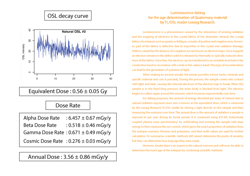 护身符年龄的计算被列为古董之一需要知道护身符从过去到现在累计接受的辐射量 (等效剂量)(Equivalent dose)。这可以由 TL/OSL 读取器 Lexsyg Research 通过对样本应用光来确定。然后随时间测量发光量。以及该护身符每年接受的辐射量(年剂量)(Equivalent dose) 。  这可以从 ICP-MS(电感耦合等离子体质谱仪)机器通过使用激光能量升华和电离样品得知。