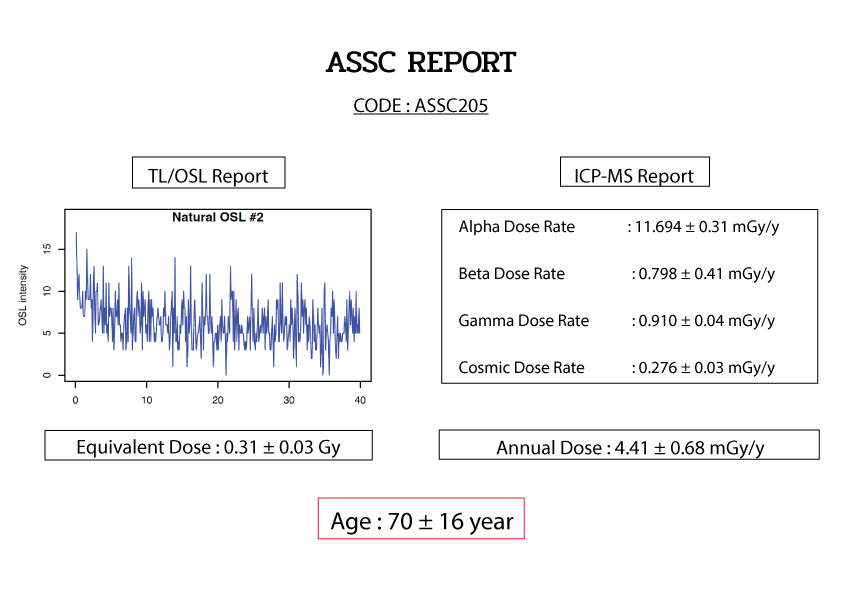 For dating, the amount of absorbed energy per mass of mineral due to natural radiation exposure since zeroing is known as the Equivalent dose which is measured by TL/OSL reader Lexsyg Research by using a light to stimulate directly to the sample then measuring it emit due to time. And the Annual dose is the amount of radiation that a sample is exposed to per annum during its burial period measure by ICP-MS (Inductively Coupled Plasma Mass Spectrometry) by using an energy from laser to sublimate the sample and ionized then measure the ion current which is precisely proportion of isotopes radiation which are Uranium, Thorium and Potassium then we bring both value for the further calculation.