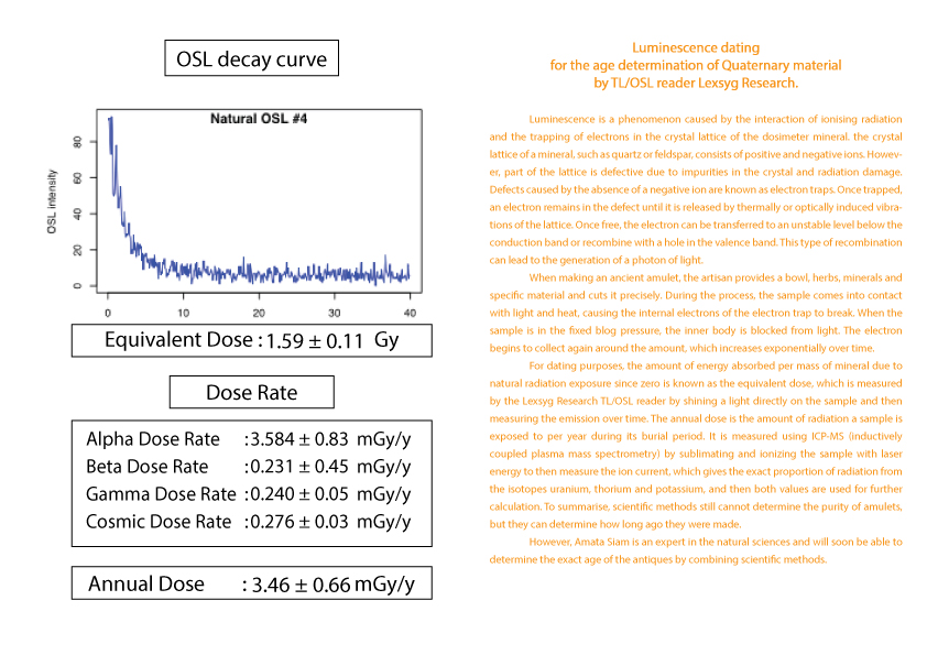 护身符年龄的计算被列为古董之一需要知道护身符从过去到现在累计接受的辐射量 (等效剂量)(Equivalent dose)。这可以由 TL/OSL 读取器 Lexsyg Research 通过对样本应用光来确定。然后随时间测量发光量。以及该护身符每年接受的辐射量(年剂量)(Equivalent dose) 。 这可以从 ICP-MS(电感耦合等离子体质谱仪)机器通过使用激光能量升华和电离样品得知。