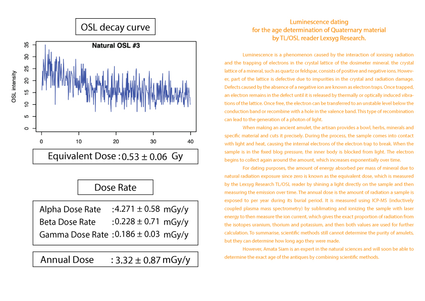护身符年龄的计算被列为古董之一需要知道护身符从过去到现在累计接受的辐射量 (等效剂量)(Equivalent dose)。这可以由 TL/OSL 读取器 Lexsyg Research 通过对样本应用光来确定。然后随时间测量发光量。以及该护身符每年接受的辐射量(年剂量)(Equivalent dose) 。 这可以从 ICP-MS(电感耦合等离子体质谱仪)机器通过使用激光能量升华和电离样品得知。