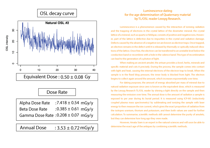 护身符年龄的计算被列为古董之一需要知道护身符从过去到现在累计接受的辐射量 (等效剂量)(Equivalent dose)。这可以由 TL/OSL 读取器 Lexsyg Research 通过对样本应用光来确定。然后随时间测量发光量。以及该护身符每年接受的辐射量(年剂量)(Equivalent dose) 。  这可以从 ICP-MS(电感耦合等离子体质谱仪)机器通过使用激光能量升华和电离样品得知。