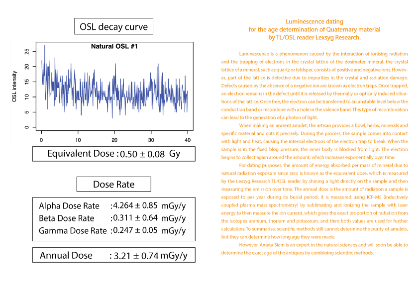 护身符年龄的计算被列为古董之一需要知道护身符从过去到现在累计接受的辐射量 (等效剂量)(Equivalent dose)。这可以由 TL/OSL 读取器 Lexsyg Research 通过对样本应用光来确定。然后随时间测量发光量。以及该护身符每年接受的辐射量(年剂量)(Equivalent dose) 。 这可以从 ICP-MS(电感耦合等离子体质谱仪)机器通过使用激光能量升华和电离样品得知。