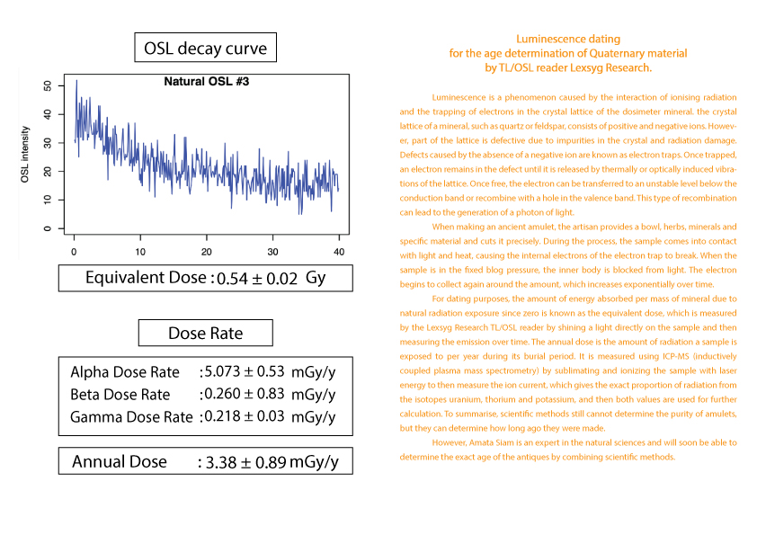 护身符年龄的计算被列为古董之一需要知道护身符从过去到现在累计接受的辐射量 (等效剂量)(Equivalent dose)。这可以由 TL/OSL 读取器 Lexsyg Research 通过对样本应用光来确定。然后随时间测量发光量。以及该护身符每年接受的辐射量(年剂量)(Equivalent dose) 。 这可以从 ICP-MS(电感耦合等离子体质谱仪)机器通过使用激光能量升华和电离样品得知。