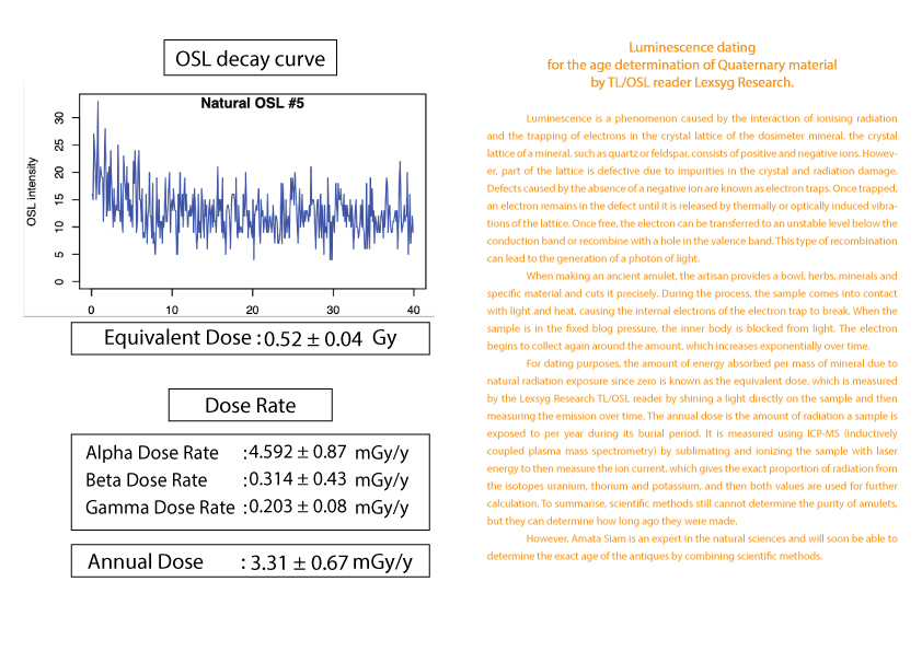 护身符年龄的计算被列为古董之一需要知道护身符从过去到现在累计接受的辐射量 (等效剂量)(Equivalent dose)。这可以由 TL/OSL 读取器 Lexsyg Research 通过对样本应用光来确定。然后随时间测量发光量。以及该护身符每年接受的辐射量(年剂量)(Equivalent dose) 。 这可以从 ICP-MS(电感耦合等离子体质谱仪)机器通过使用激光能量升华和电离样品得知。