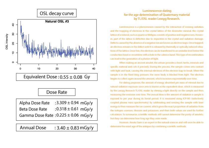 护身符年龄的计算被列为古董之一需要知道护身符从过去到现在累计接受的辐射量 (等效剂量)(Equivalent dose)。这可以由 TL/OSL 读取器 Lexsyg Research 通过对样本应用光来确定。然后随时间测量发光量。以及该护身符每年接受的辐射量(年剂量)(Equivalent dose) 。 这可以从 ICP-MS(电感耦合等离子体质谱仪)机器通过使用激光能量升华和电离样品得知。
