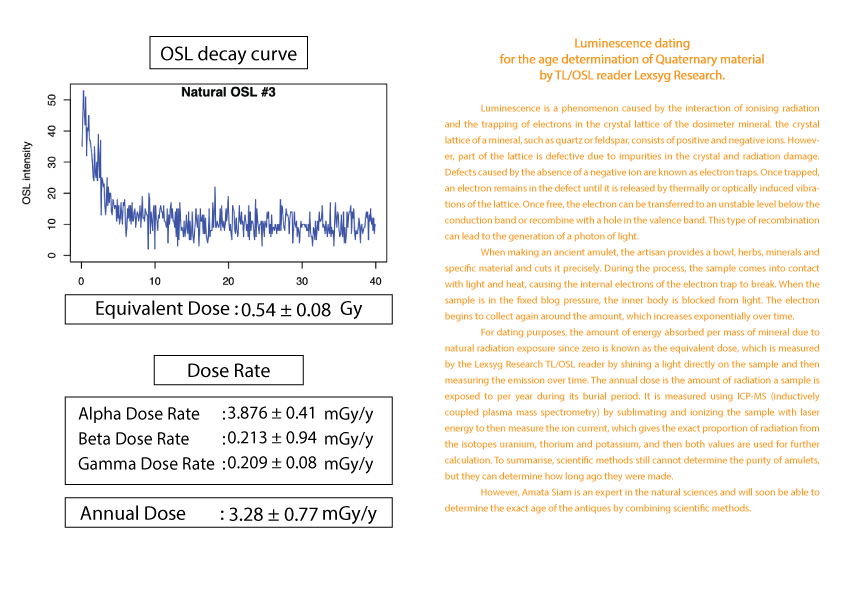 护身符年龄的计算被列为古董之一需要知道护身符从过去到现在累计接受的辐射量 (等效剂量)(Equivalent dose)。这可以由 TL/OSL 读取器 Lexsyg Research 通过对样本应用光来确定。然后随时间测量发光量。以及该护身符每年接受的辐射量(年剂量)(Equivalent dose) 。 这可以从 ICP-MS(电感耦合等离子体质谱仪)机器通过使用激光能量升华和电离样品得知。