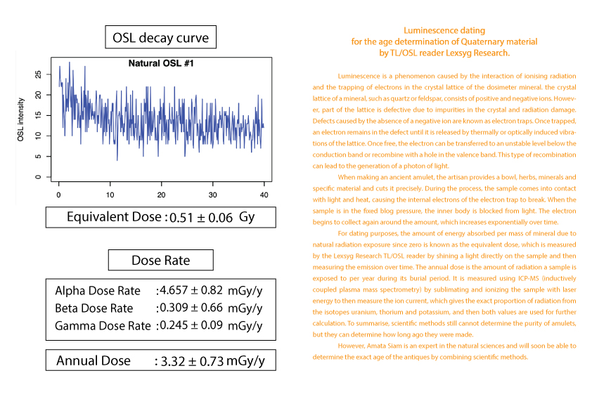 护身符年龄的计算被列为古董之一需要知道护身符从过去到现在累计接受的辐射量 (等效剂量)(Equivalent dose)。这可以由 TL/OSL 读取器 Lexsyg Research 通过对样本应用光来确定。然后随时间测量发光量。以及该护身符每年接受的辐射量(年剂量)(Equivalent dose) 。  这可以从 ICP-MS(电感耦合等离子体质谱仪)机器通过使用激光能量升华和电离样品得知。