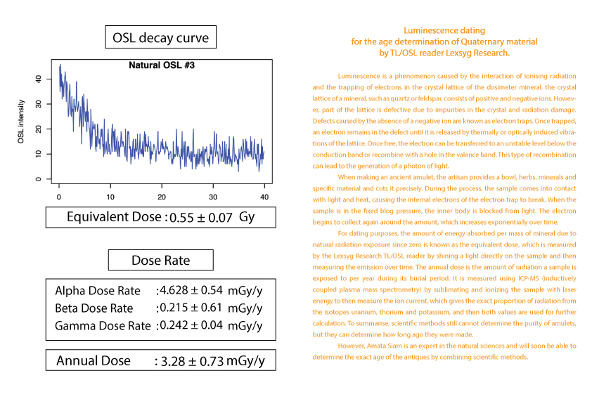 护身符年龄的计算被列为古董之一需要知道护身符从过去到现在累计接受的辐射量 (等效剂量)(Equivalent dose)。这可以由 TL/OSL 读取器 Lexsyg Research 通过对样本应用光来确定。然后随时间测量发光量。以及该护身符每年接受的辐射量(年剂量)(Equivalent dose) 。  这可以从 ICP-MS(电感耦合等离子体质谱仪)机器通过使用激光能量升华和电离样品得知。