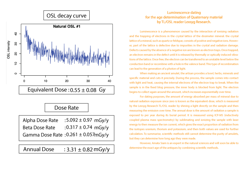 For dating, the amount of absorbed energy per mass of mineral due to natural radiation exposure since zeroing is known as the Equivalent dose which is measured by TL/OSL reader Lexsyg Research by using a light to stimulate directly to the sample then measuring it emit due to time. And the Annual dose is the amount of radiation that a sample is exposed to per annum during its burial period measure by ICP-MS (Inductively Coupled Plasma Mass Spectrometry) by using an energy from laser to sublimate the sample and ionized then measure the ion current which is precisely proportion of isotopes radiation which are Uranium, Thorium and Potassium then we bring both value for the further calculation.