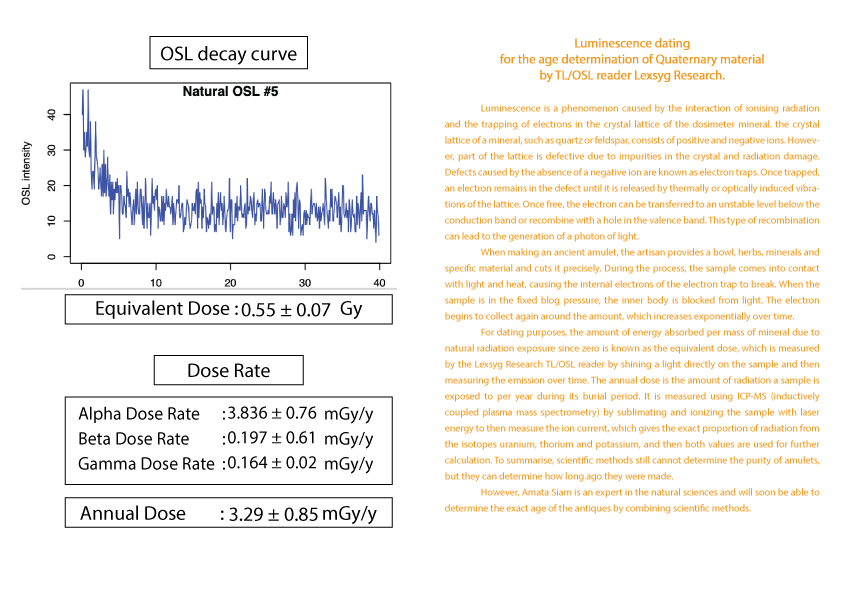 护身符年龄的计算被列为古董之一需要知道护身符从过去到现在累计接受的辐射量 (等效剂量)(Equivalent dose)。这可以由 TL/OSL 读取器 Lexsyg Research 通过对样本应用光来确定。然后随时间测量发光量。以及该护身符每年接受的辐射量(年剂量)(Equivalent dose) 。  这可以从 ICP-MS(电感耦合等离子体质谱仪)机器通过使用激光能量升华和电离样品得知。