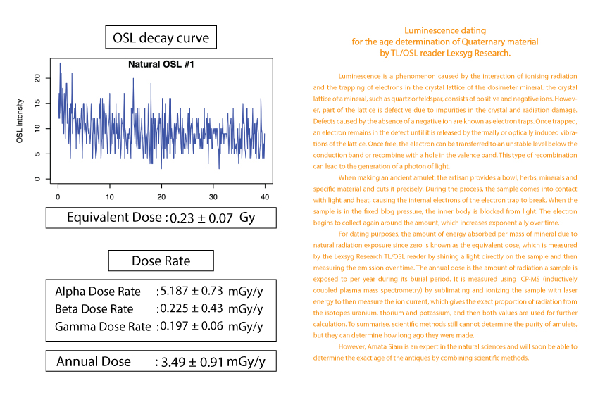 护身符年龄的计算被列为古董之一需要知道护身符从过去到现在累计接受的辐射量 (等效剂量)(Equivalent dose)。这可以由 TL/OSL 读取器 Lexsyg Research 通过对样本应用光来确定。然后随时间测量发光量。以及该护身符每年接受的辐射量(年剂量)(Equivalent dose) 。  这可以从 ICP-MS(电感耦合等离子体质谱仪)机器通过使用激光能量升华和电离样品得知。