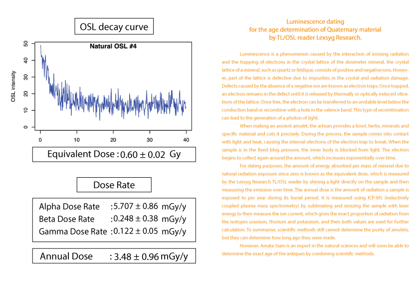 护身符年龄的计算被列为古董之一需要知道护身符从过去到现在累计接受的辐射量 (等效剂量)(Equivalent dose)。这可以由 TL/OSL 读取器 Lexsyg Research 通过对样本应用光来确定。然后随时间测量发光量。以及该护身符每年接受的辐射量(年剂量)(Equivalent dose) 。  这可以从 ICP-MS(电感耦合等离子体质谱仪)机器通过使用激光能量升华和电离样品得知。