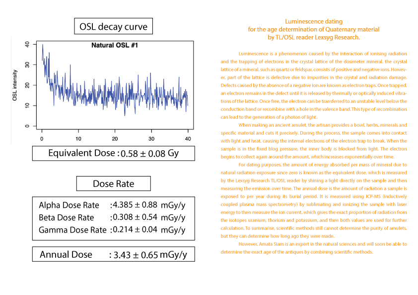 护身符年龄的计算被列为古董之一需要知道护身符从过去到现在累计接受的辐射量 (等效剂量)(Equivalent dose)。这可以由 TL/OSL 读取器 Lexsyg Research 通过对样本应用光来确定。然后随时间测量发光量。以及该护身符每年接受的辐射量(年剂量)(Equivalent dose) 。 这可以从 ICP-MS(电感耦合等离子体质谱仪)机器通过使用激光能量升华和电离样品得知。