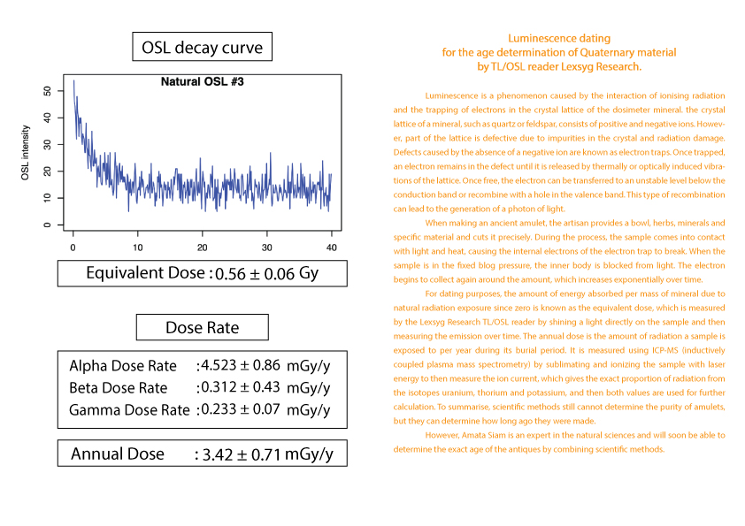 护身符年龄的计算被列为古董之一需要知道护身符从过去到现在累计接受的辐射量 (等效剂量)(Equivalent dose)。这可以由 TL/OSL 读取器 Lexsyg Research 通过对样本应用光来确定。然后随时间测量发光量。以及该护身符每年接受的辐射量(年剂量)(Equivalent dose) 。 这可以从 ICP-MS(电感耦合等离子体质谱仪)机器通过使用激光能量升华和电离样品得知。