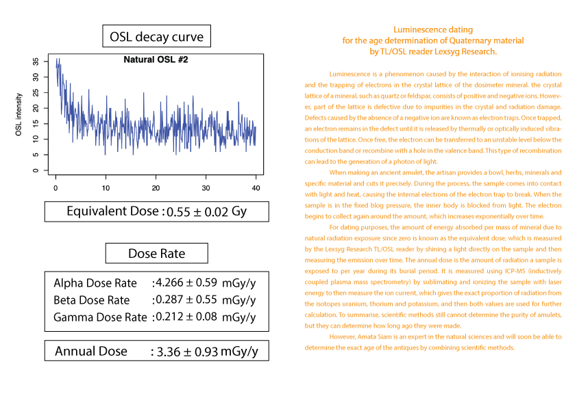 护身符年龄的计算被列为古董之一需要知道护身符从过去到现在累计接受的辐射量 (等效剂量)(Equivalent dose)。这可以由 TL/OSL 读取器 Lexsyg Research 通过对样本应用光来确定。然后随时间测量发光量。以及该护身符每年接受的辐射量(年剂量)(Equivalent dose) 。 这可以从 ICP-MS(电感耦合等离子体质谱仪)机器通过使用激光能量升华和电离样品得知。