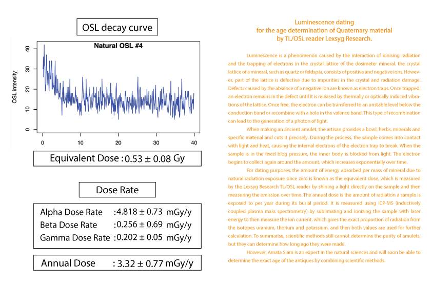 护身符年龄的计算被列为古董之一需要知道护身符从过去到现在累计接受的辐射量 (等效剂量)(Equivalent dose)。这可以由 TL/OSL 读取器 Lexsyg Research 通过对样本应用光来确定。然后随时间测量发光量。以及该护身符每年接受的辐射量(年剂量)(Equivalent dose) 。  这可以从 ICP-MS(电感耦合等离子体质谱仪)机器通过使用激光能量升华和电离样品得知。
