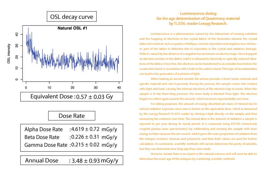 护身符年龄的计算被列为古董之一需要知道护身符从过去到现在累计接受的辐射量 (等效剂量)(Equivalent dose)。这可以由 TL/OSL 读取器 Lexsyg Research 通过对样本应用光来确定。然后随时间测量发光量。以及该护身符每年接受的辐射量(年剂量)(Equivalent dose) 。  这可以从 ICP-MS(电感耦合等离子体质谱仪)机器通过使用激光能量升华和电离样品得知。