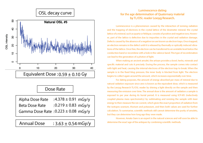 护身符年龄的计算被列为古董之一需要知道护身符从过去到现在累计接受的辐射量 (等效剂量)(Equivalent dose)。这可以由 TL/OSL 读取器 Lexsyg Research 通过对样本应用光来确定。然后随时间测量发光量。以及该护身符每年接受的辐射量(年剂量)(Equivalent dose) 。  这可以从 ICP-MS(电感耦合等离子体质谱仪)机器通过使用激光能量升华和电离样品得知。