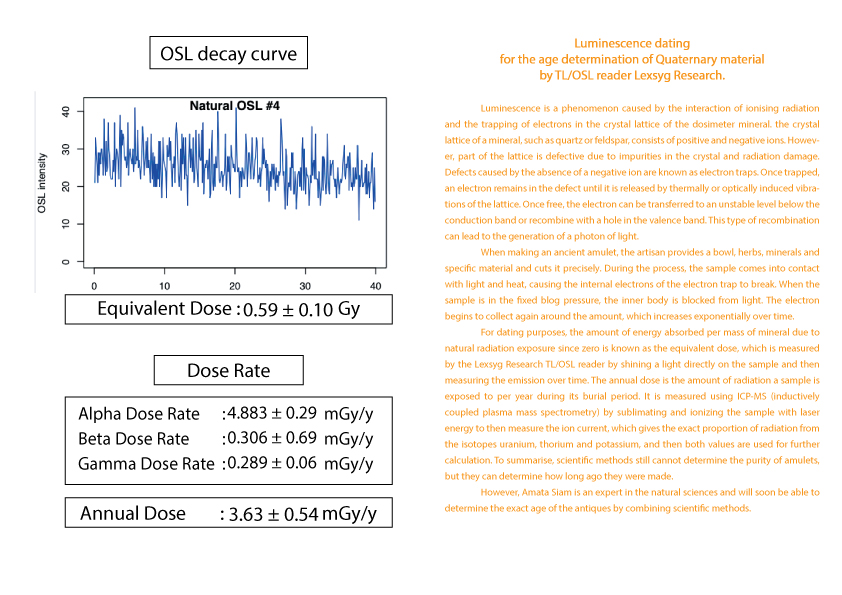 护身符年龄的计算被列为古董之一需要知道护身符从过去到现在累计接受的辐射量 (等效剂量)(Equivalent dose)。这可以由 TL/OSL 读取器 Lexsyg Research 通过对样本应用光来确定。然后随时间测量发光量。以及该护身符每年接受的辐射量(年剂量)(Equivalent dose) 。 这可以从 ICP-MS(电感耦合等离子体质谱仪)机器通过使用激光能量升华和电离样品得知。