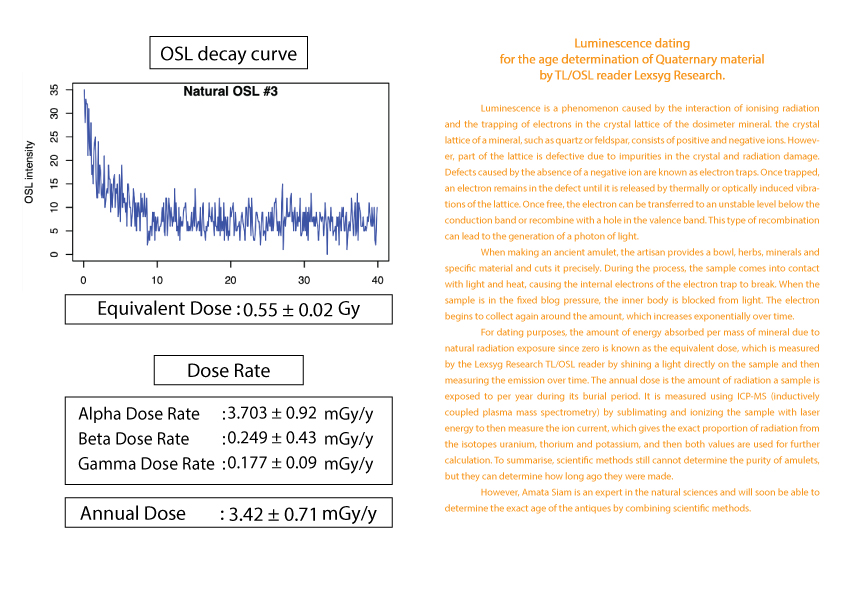 护身符年龄的计算被列为古董之一需要知道护身符从过去到现在累计接受的辐射量 (等效剂量)(Equivalent dose)。这可以由 TL/OSL 读取器 Lexsyg Research 通过对样本应用光来确定。然后随时间测量发光量。以及该护身符每年接受的辐射量(年剂量)(Equivalent dose) 。  这可以从 ICP-MS(电感耦合等离子体质谱仪)机器通过使用激光能量升华和电离样品得知。