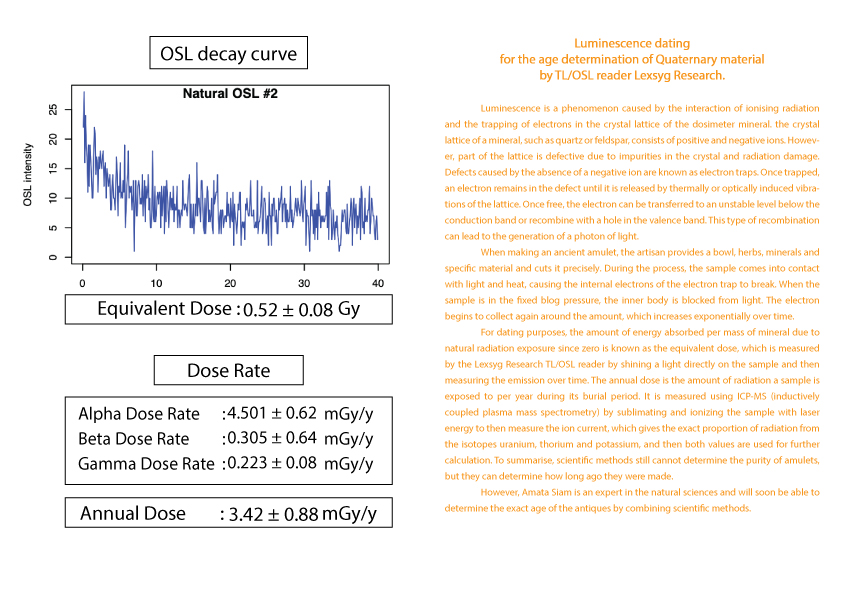 护身符年龄的计算被列为古董之一需要知道护身符从过去到现在累计接受的辐射量 (等效剂量)(Equivalent dose)。这可以由 TL/OSL 读取器 Lexsyg Research 通过对样本应用光来确定。然后随时间测量发光量。以及该护身符每年接受的辐射量(年剂量)(Equivalent dose) 。 这可以从 ICP-MS(电感耦合等离子体质谱仪)机器通过使用激光能量升华和电离样品得知。