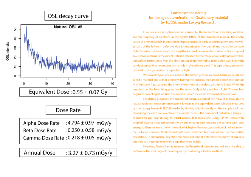 护身符年龄的计算被列为古董之一需要知道护身符从过去到现在累计接受的辐射量 (等效剂量)(Equivalent dose)。这可以由 TL/OSL 读取器 Lexsyg Research 通过对样本应用光来确定。然后随时间测量发光量。以及该护身符每年接受的辐射量(年剂量)(Equivalent dose) 。  这可以从 ICP-MS(电感耦合等离子体质谱仪)机器通过使用激光能量升华和电离样品得知。