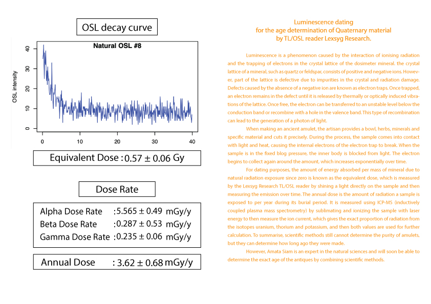护身符年龄的计算被列为古董之一需要知道护身符从过去到现在累计接受的辐射量 (等效剂量)(Equivalent dose)。这可以由 TL/OSL 读取器 Lexsyg Research 通过对样本应用光来确定。然后随时间测量发光量。以及该护身符每年接受的辐射量(年剂量)(Equivalent dose) 。  这可以从 ICP-MS(电感耦合等离子体质谱仪)机器通过使用激光能量升华和电离样品得知。