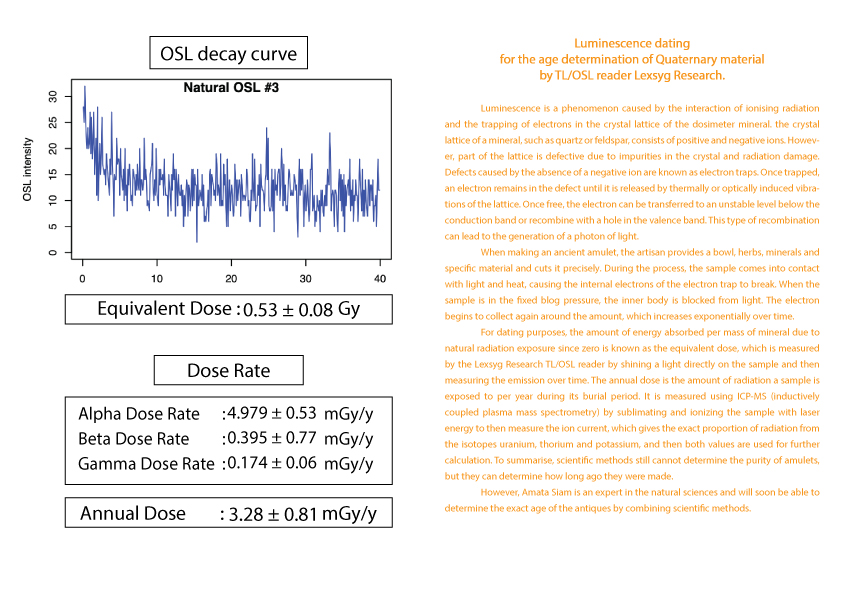 护身符年龄的计算被列为古董之一需要知道护身符从过去到现在累计接受的辐射量 (等效剂量)(Equivalent dose)。这可以由 TL/OSL 读取器 Lexsyg Research 通过对样本应用光来确定。然后随时间测量发光量。以及该护身符每年接受的辐射量(年剂量)(Equivalent dose) 。 这可以从 ICP-MS(电感耦合等离子体质谱仪)机器通过使用激光能量升华和电离样品得知。