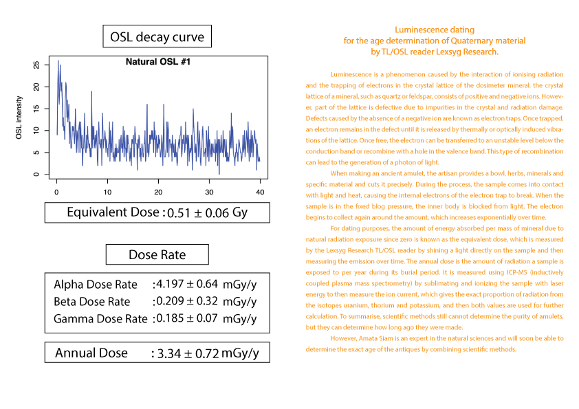 护身符年龄的计算被列为古董之一需要知道护身符从过去到现在累计接受的辐射量 (等效剂量)(Equivalent dose)。这可以由 TL/OSL 读取器 Lexsyg Research 通过对样本应用光来确定。然后随时间测量发光量。以及该护身符每年接受的辐射量(年剂量)(Equivalent dose) 。  这可以从 ICP-MS(电感耦合等离子体质谱仪)机器通过使用激光能量升华和电离样品得知。
