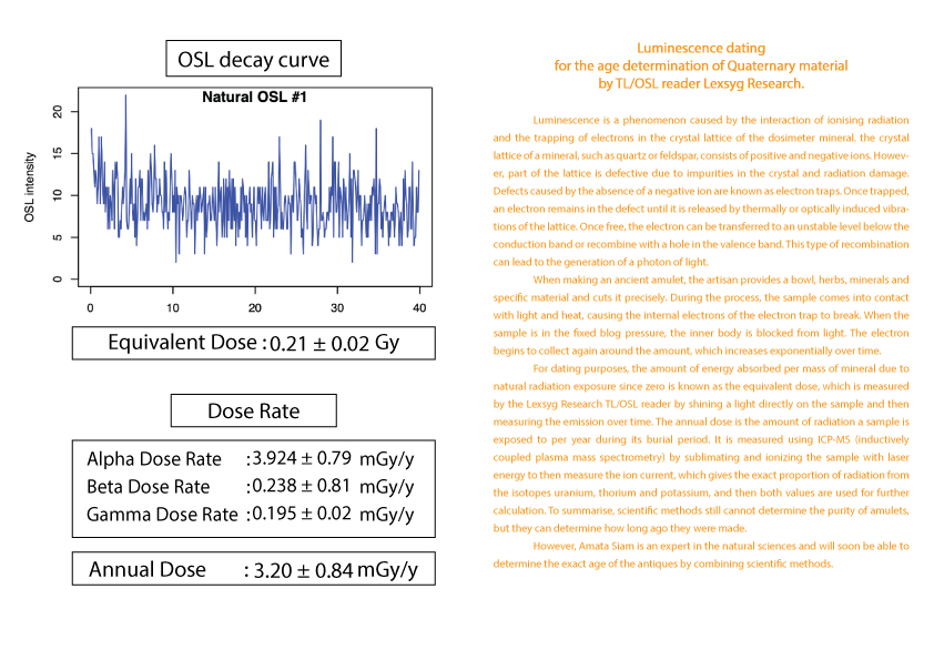 护身符年龄的计算被列为古董之一需要知道护身符从过去到现在累计接受的辐射量 (等效剂量)(Equivalent dose)。这可以由 TL/OSL 读取器 Lexsyg Research 通过对样本应用光来确定。然后随时间测量发光量。以及该护身符每年接受的辐射量(年剂量)(Equivalent dose) 。 这可以从 ICP-MS(电感耦合等离子体质谱仪)机器通过使用激光能量升华和电离样品得知。