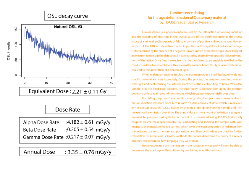 护身符年龄的计算被列为古董之一需要知道护身符从过去到现在累计接受的辐射量 (等效剂量)(Equivalent dose)。这可以由 TL/OSL 读取器 Lexsyg Research 通过对样本应用光来确定。然后随时间测量发光量。以及该护身符每年接受的辐射量(年剂量)(Equivalent dose) 。 这可以从 ICP-MS(电感耦合等离子体质谱仪)机器通过使用激光能量升华和电离样品得知。