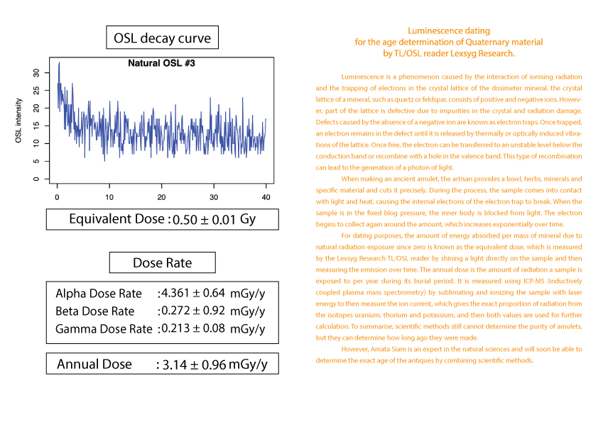 护身符年龄的计算被列为古董之一需要知道护身符从过去到现在累计接受的辐射量 (等效剂量)(Equivalent dose)。这可以由 TL/OSL 读取器 Lexsyg Research 通过对样本应用光来确定。然后随时间测量发光量。以及该护身符每年接受的辐射量(年剂量)(Equivalent dose) 。 这可以从 ICP-MS(电感耦合等离子体质谱仪)机器通过使用激光能量升华和电离样品得知。
