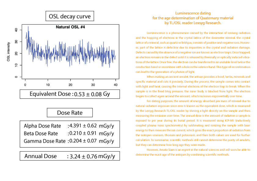 护身符年龄的计算被列为古董之一需要知道护身符从过去到现在累计接受的辐射量 (等效剂量)(Equivalent dose)。这可以由 TL/OSL 读取器 Lexsyg Research 通过对样本应用光来确定。然后随时间测量发光量。以及该护身符每年接受的辐射量(年剂量)(Equivalent dose) 。 这可以从 ICP-MS(电感耦合等离子体质谱仪)机器通过使用激光能量升华和电离样品得知。