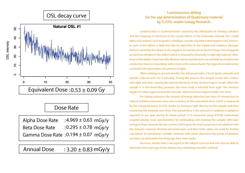 护身符年龄的计算被列为古董之一需要知道护身符从过去到现在累计接受的辐射量 (等效剂量)(Equivalent dose)。这可以由 TL/OSL 读取器 Lexsyg Research 通过对样本应用光来确定。然后随时间测量发光量。以及该护身符每年接受的辐射量(年剂量)(Equivalent dose) 。 这可以从 ICP-MS(电感耦合等离子体质谱仪)机器通过使用激光能量升华和电离样品得知。