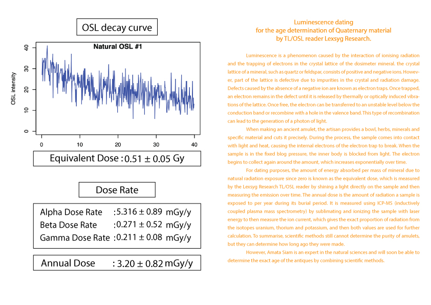 护身符年龄的计算被列为古董之一需要知道护身符从过去到现在累计接受的辐射量 (等效剂量)(Equivalent dose)。这可以由 TL/OSL 读取器 Lexsyg Research 通过对样本应用光来确定。然后随时间测量发光量。以及该护身符每年接受的辐射量(年剂量)(Equivalent dose) 。  这可以从 ICP-MS(电感耦合等离子体质谱仪)机器通过使用激光能量升华和电离样品得知。