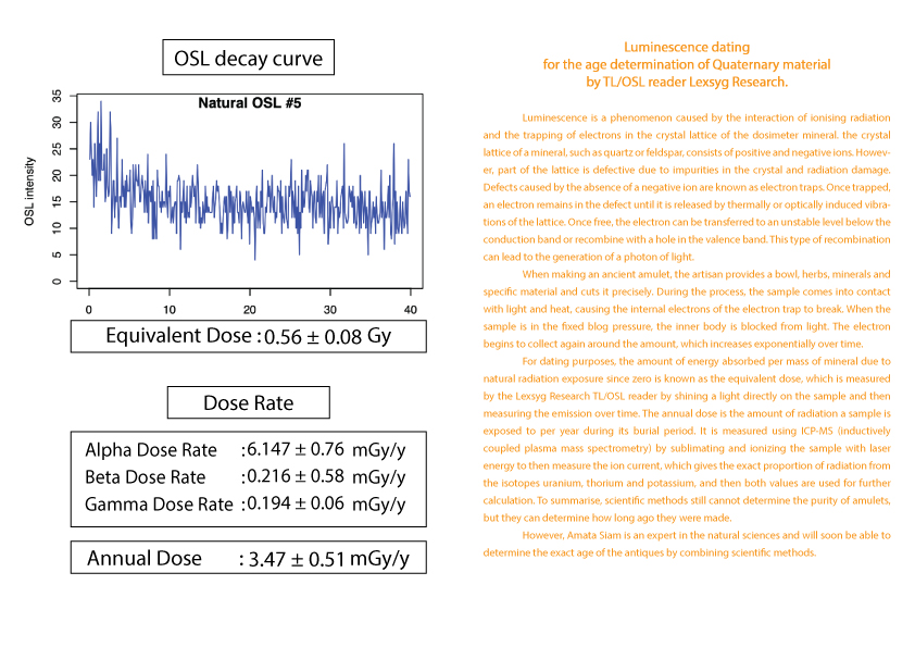 护身符年龄的计算被列为古董之一需要知道护身符从过去到现在累计接受的辐射量 (等效剂量)(Equivalent dose)。这可以由 TL/OSL 读取器 Lexsyg Research 通过对样本应用光来确定。然后随时间测量发光量。以及该护身符每年接受的辐射量(年剂量)(Equivalent dose) 。 这可以从 ICP-MS(电感耦合等离子体质谱仪)机器通过使用激光能量升华和电离样品得知。