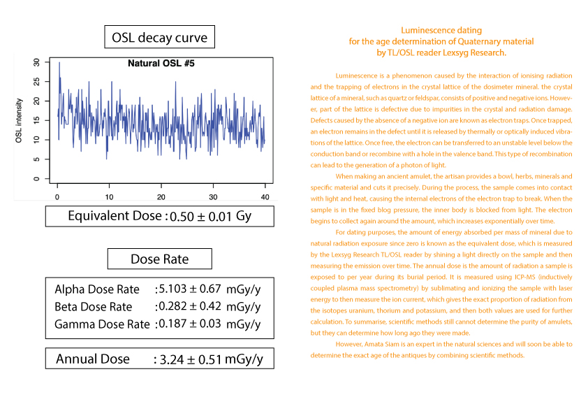 护身符年龄的计算被列为古董之一需要知道护身符从过去到现在累计接受的辐射量 (等效剂量)(Equivalent dose)。这可以由 TL/OSL 读取器 Lexsyg Research 通过对样本应用光来确定。然后随时间测量发光量。以及该护身符每年接受的辐射量(年剂量)(Equivalent dose) 。  这可以从 ICP-MS(电感耦合等离子体质谱仪)机器通过使用激光能量升华和电离样品得知。