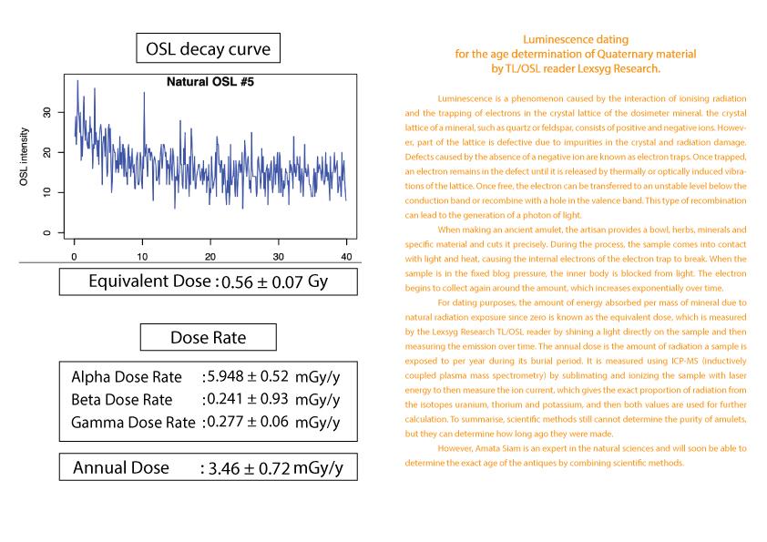 护身符年龄的计算被列为古董之一需要知道护身符从过去到现在累计接受的辐射量 (等效剂量)(Equivalent dose)。这可以由 TL/OSL 读取器 Lexsyg Research 通过对样本应用光来确定。然后随时间测量发光量。以及该护身符每年接受的辐射量(年剂量)(Equivalent dose) 。 这可以从 ICP-MS(电感耦合等离子体质谱仪)机器通过使用激光能量升华和电离样品得知。