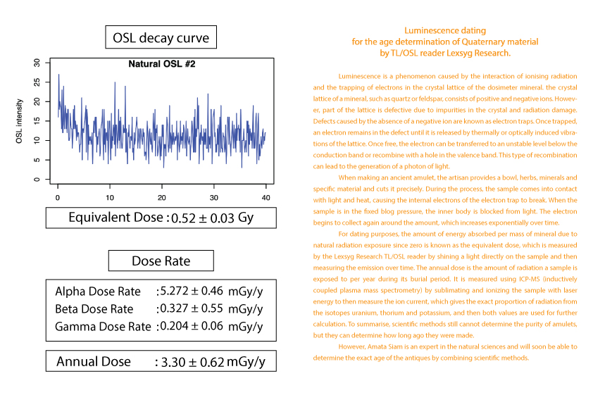 护身符年龄的计算被列为古董之一需要知道护身符从过去到现在累计接受的辐射量 (等效剂量)(Equivalent dose)。这可以由 TL/OSL 读取器 Lexsyg Research 通过对样本应用光来确定。然后随时间测量发光量。以及该护身符每年接受的辐射量(年剂量)(Equivalent dose) 。  这可以从 ICP-MS(电感耦合等离子体质谱仪)机器通过使用激光能量升华和电离样品得知。