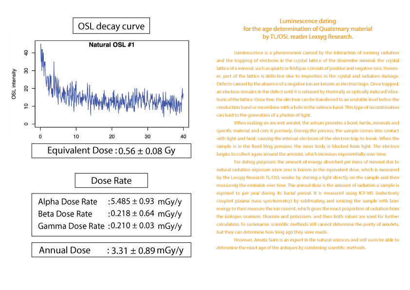 护身符年龄的计算被列为古董之一需要知道护身符从过去到现在累计接受的辐射量 (等效剂量)(Equivalent dose)。这可以由 TL/OSL 读取器 Lexsyg Research 通过对样本应用光来确定。然后随时间测量发光量。以及该护身符每年接受的辐射量(年剂量)(Equivalent dose) 。 这可以从 ICP-MS(电感耦合等离子体质谱仪)机器通过使用激光能量升华和电离样品得知。