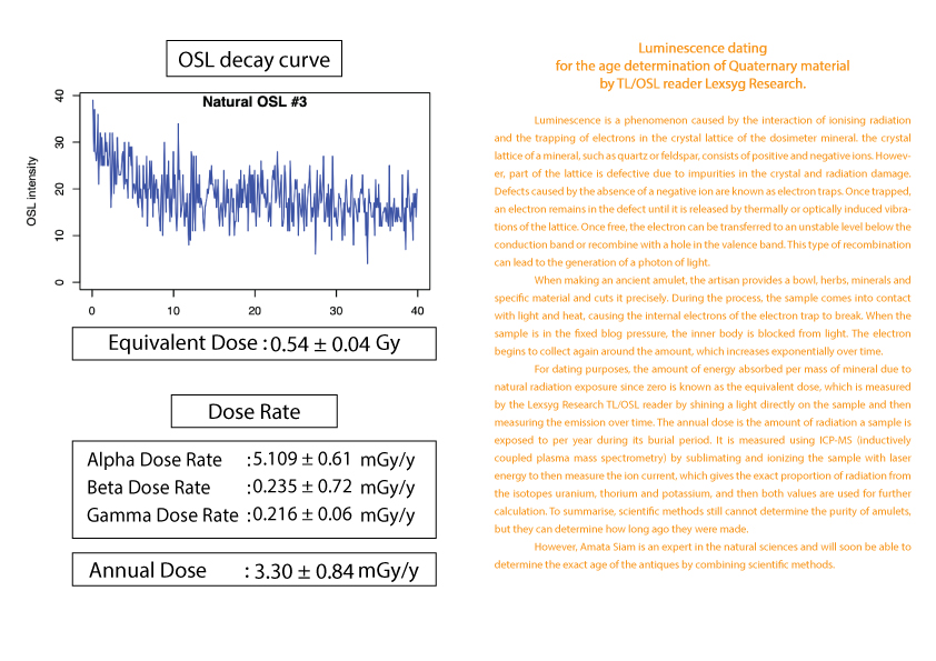 护身符年龄的计算被列为古董之一需要知道护身符从过去到现在累计接受的辐射量 (等效剂量)(Equivalent dose)。这可以由 TL/OSL 读取器 Lexsyg Research 通过对样本应用光来确定。然后随时间测量发光量。以及该护身符每年接受的辐射量(年剂量)(Equivalent dose) 。 这可以从 ICP-MS(电感耦合等离子体质谱仪)机器通过使用激光能量升华和电离样品得知。
