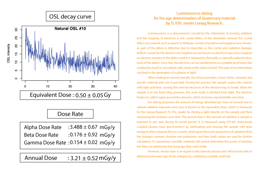 护身符年龄的计算被列为古董之一需要知道护身符从过去到现在累计接受的辐射量 (等效剂量)(Equivalent dose)。这可以由 TL/OSL 读取器 Lexsyg Research 通过对样本应用光来确定。然后随时间测量发光量。以及该护身符每年接受的辐射量(年剂量)(Equivalent dose) 。  这可以从 ICP-MS(电感耦合等离子体质谱仪)机器通过使用激光能量升华和电离样品得知。