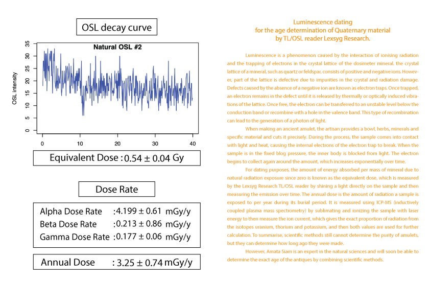护身符年龄的计算被列为古董之一需要知道护身符从过去到现在累计接受的辐射量 (等效剂量)(Equivalent dose)。这可以由 TL/OSL 读取器 Lexsyg Research 通过对样本应用光来确定。然后随时间测量发光量。以及该护身符每年接受的辐射量(年剂量)(Equivalent dose) 。 这可以从 ICP-MS(电感耦合等离子体质谱仪)机器通过使用激光能量升华和电离样品得知。