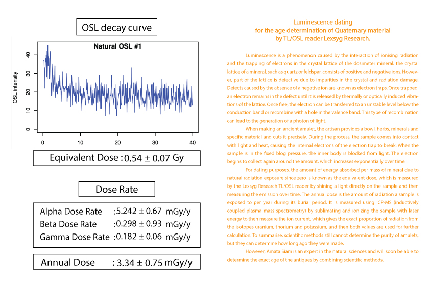 护身符年龄的计算被列为古董之一需要知道护身符从过去到现在累计接受的辐射量 (等效剂量)(Equivalent dose)。这可以由 TL/OSL 读取器 Lexsyg Research 通过对样本应用光来确定。然后随时间测量发光量。以及该护身符每年接受的辐射量(年剂量)(Equivalent dose) 。 这可以从 ICP-MS(电感耦合等离子体质谱仪)机器通过使用激光能量升华和电离样品得知。