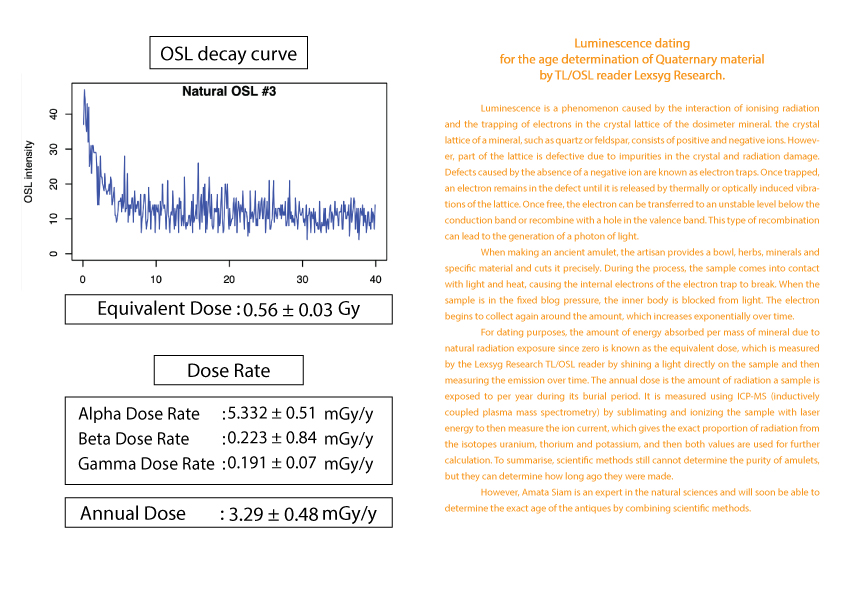 护身符年龄的计算被列为古董之一需要知道护身符从过去到现在累计接受的辐射量 (等效剂量)(Equivalent dose)。这可以由 TL/OSL 读取器 Lexsyg Research 通过对样本应用光来确定。然后随时间测量发光量。以及该护身符每年接受的辐射量(年剂量)(Equivalent dose) 。  这可以从 ICP-MS(电感耦合等离子体质谱仪)机器通过使用激光能量升华和电离样品得知。